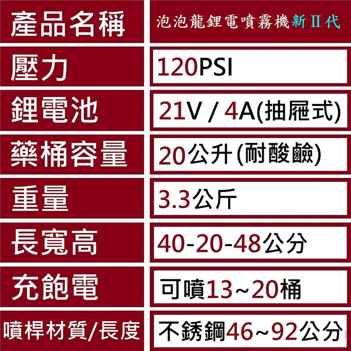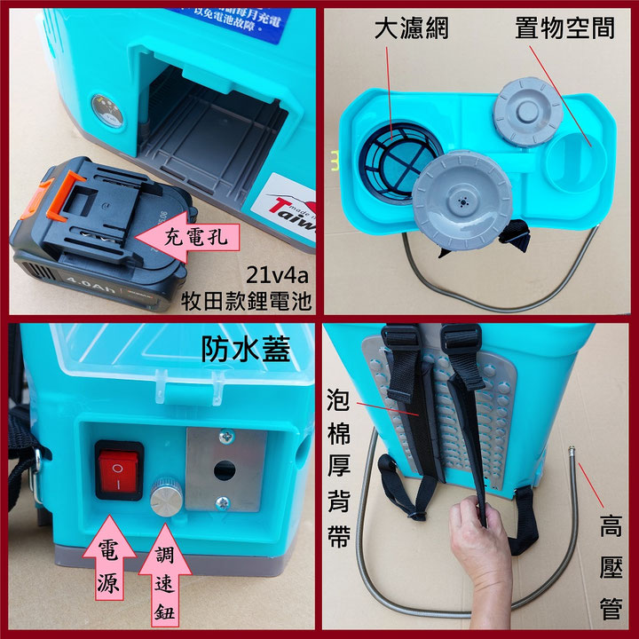 ② 不鏽鋼噴桿,多種噴嘴,調速旋鈕、高速開關、電量顯示,使用簡單,防濕透氣背墊、背帶,更舒適